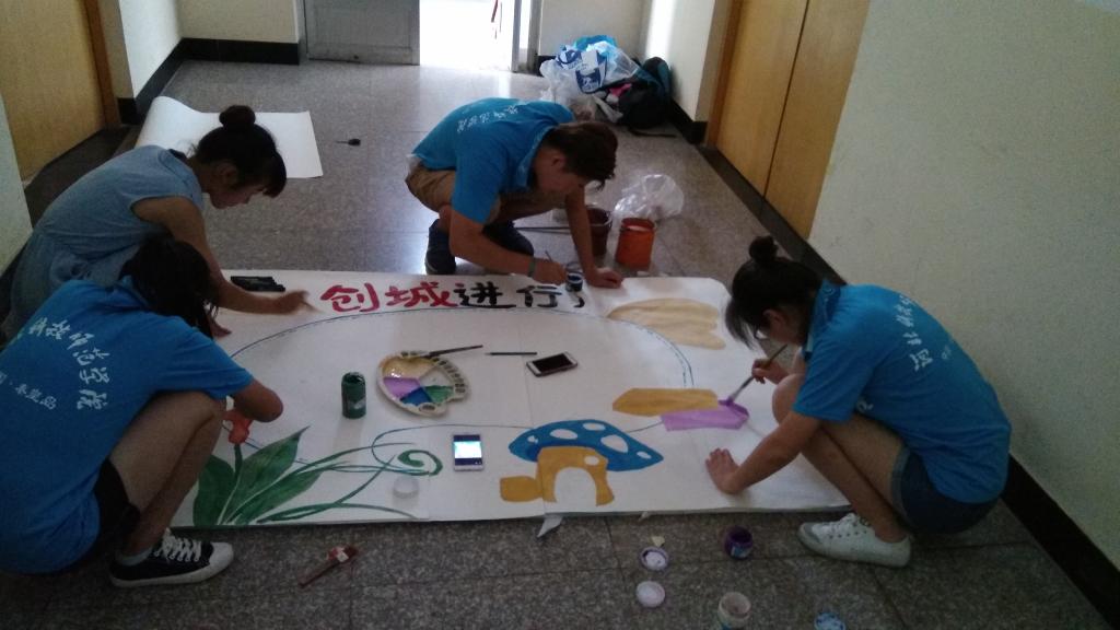这天上午,队员们寻找宣传木板,画笔,颜料,纸张等一系列材料,着手绘制宣传“创城”标语板。大家集思广益,构图、调色、涂色,齐心协力,将宣传板设计制作得有模有样,给人眼前一亮。
