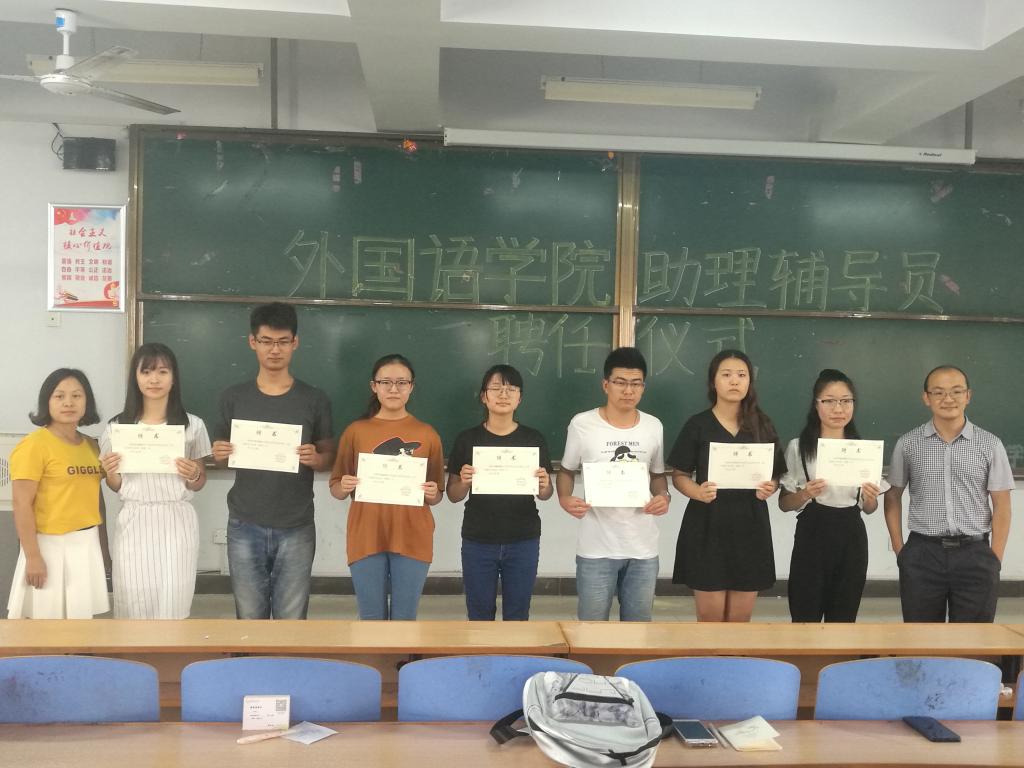 为了提高2017级新生班辅导员管理效率,发挥朋辈辅导的良好作用,提升新生接待工作的服务质量,外国语学院于2017年9月8日中午12:30在综合楼312教室举行了2017级新生班助理辅导员聘任仪式。学院学工办老师参加了聘任仪式。