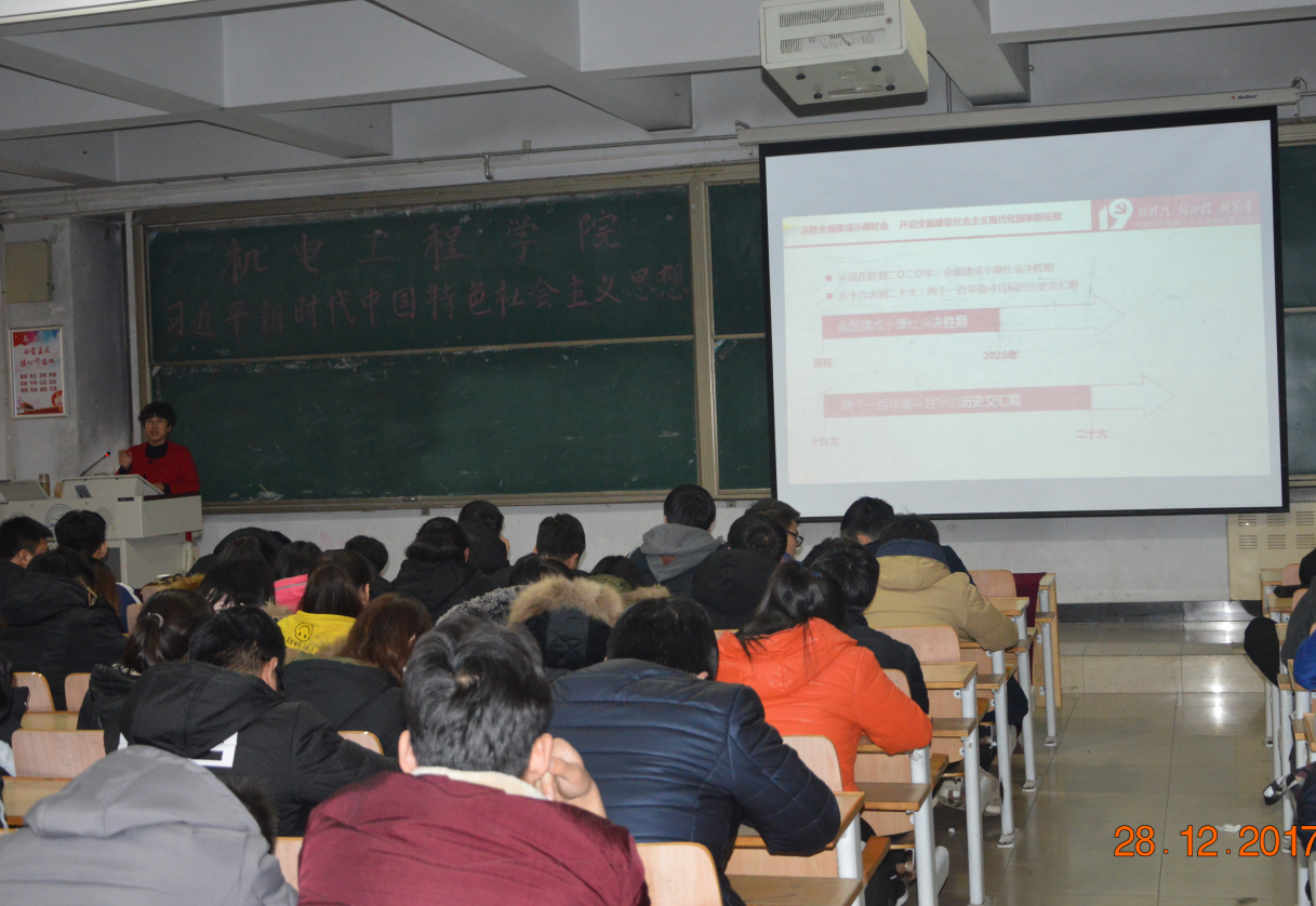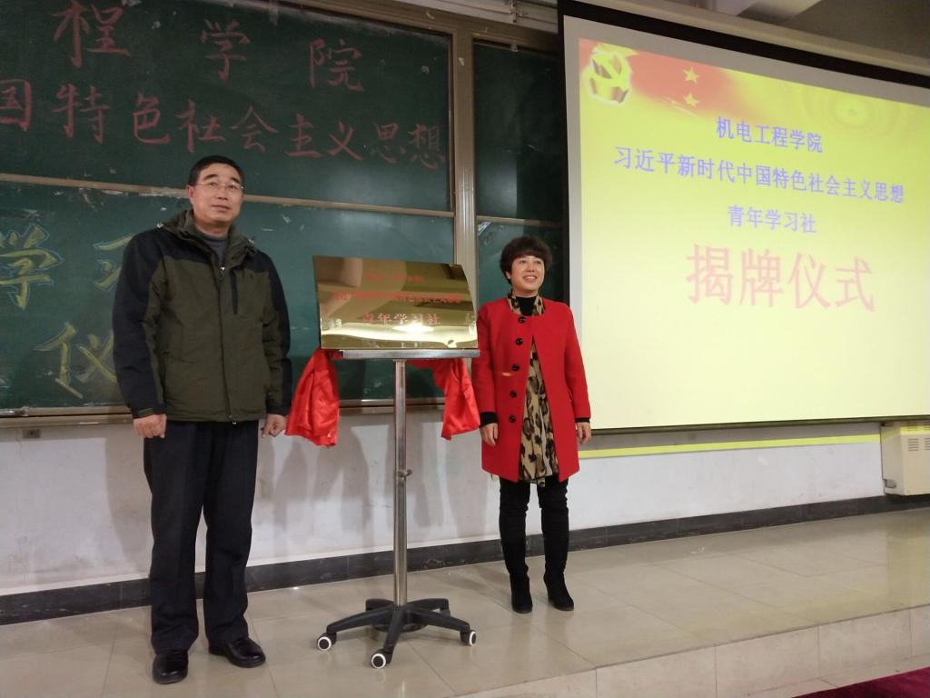 2017年12月28日下午,机电工程学院在昌黎校区B105教室举办了“习近平新时代中国特色社会主义思想青年学习社”(简称“青年学习社”)成立仪式。机电工程学院领导班子成员、学生党支部书记及学院全体学生党员、入党积极分子等共200余人参加了成立仪式。仪式由“青年学习社”第一届名誉会长主持。
