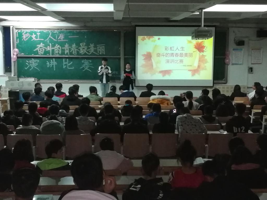 为深入学习贯彻党的十九大精神,交流学习体会,激发广大青年用中国梦激扬青春梦的斗志,2018年4月24日晚,机电学院在昌黎校区主楼教室举办了以“彩虹人生——奋斗的青春最美丽”为主题的演讲比赛。演讲赛由学院分团委与青年学习社联合举办,机电学院分团委负责人、学习社成员及新生代表共120余人参加了活动。