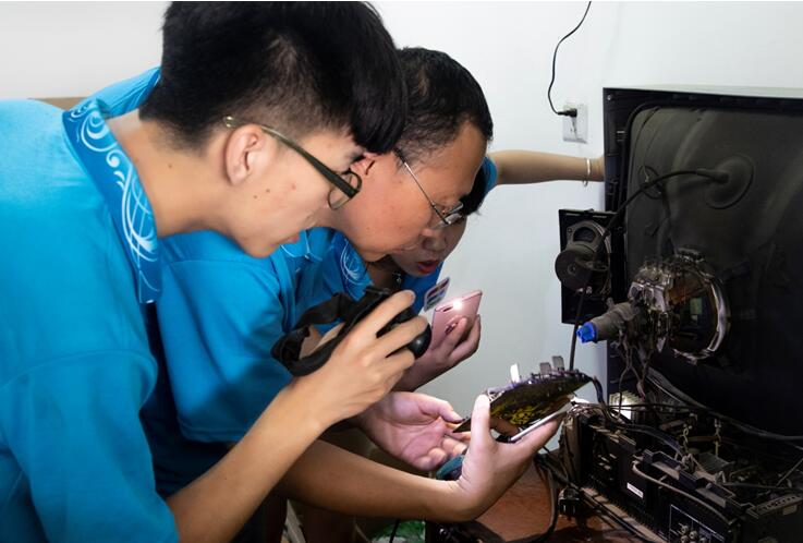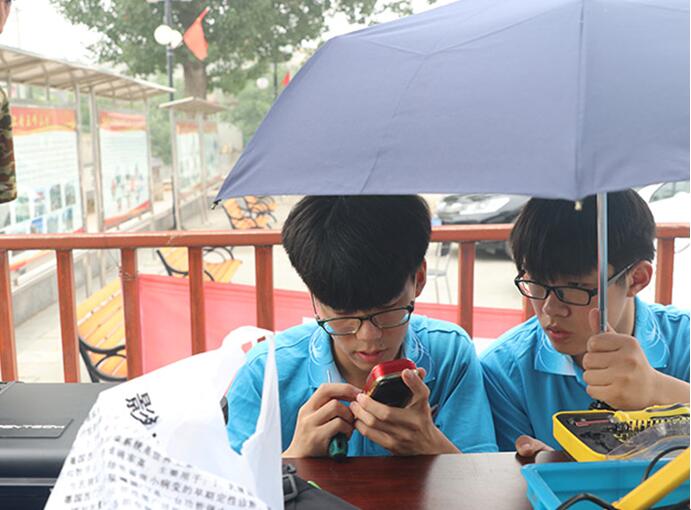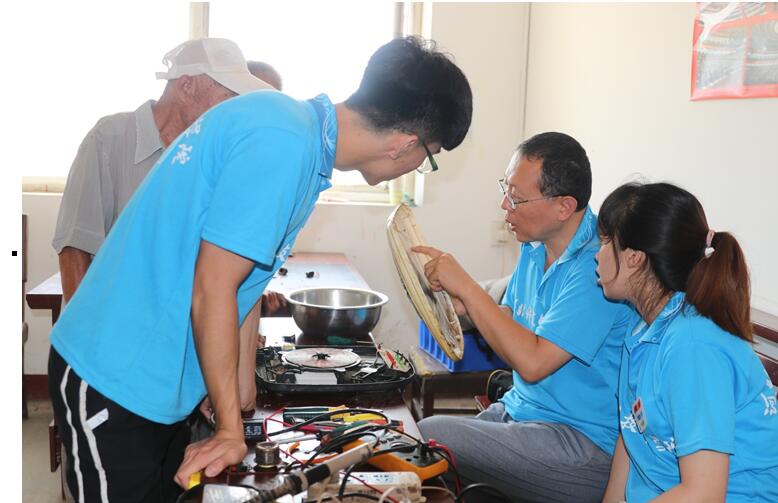 维修刚刚开始,就有老爷爷骑着三轮车将电视机带到了我们的维修区。蔺志鹏老师打开布满灰尘的台式电视机的后盖,开始了检查、修理的工作。老师专注于修理工作,水也顾不上喝。修理的电器没有断过,蔺志鹏老师笑盈盈的脸颊上的汗珠也没有断过。维修工作渐渐加重,桌子上、地板上,无一不摆放着损坏电器,毫无空闲之处。准备返回时,一位已年迈驼背的老奶奶,步履蹒跚地拿着损坏的电饭煲放到我们桌前,实践小队将已收拾好的修理工具再次掏了出来,将老奶奶的电饭煲修理好之后才踏上返程的路。