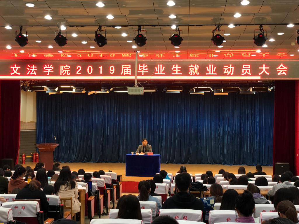 10月25日下午2点,文法学院2019届毕业生就业动员大会在二楼报告厅顺利召开。文法学院党委负责同志、毕业班辅导员、学工办全体老师以及2019届全体毕业生共400多人参加了本次大会。