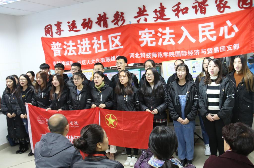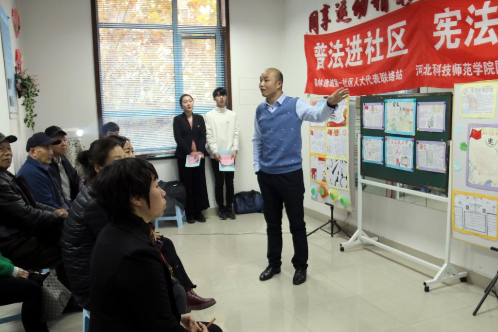 2018年11月26日,财经学院国际经济与贸易专业1601班团支部携手海港区白塔岭街道森林逸城第一社区人大代表联络站开展“普法进社区,宪法入民心”宣传活动。学院党委书记参加普法宣传活动并现场接受秦皇岛市电视台采访。