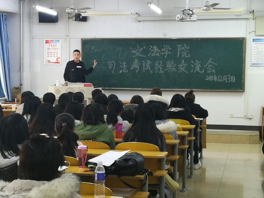 为进一步加强学院学生对司法考试准备工作的认识,提升大家参加司法考试的信心与能力,12月3日上午,文法学院在开发区校区806教室举办了2018年司法考试经验交流会。6名在今年司法考试中取得优异成绩的学生以及2016级法学专业的全体学生参加了此次交流会。