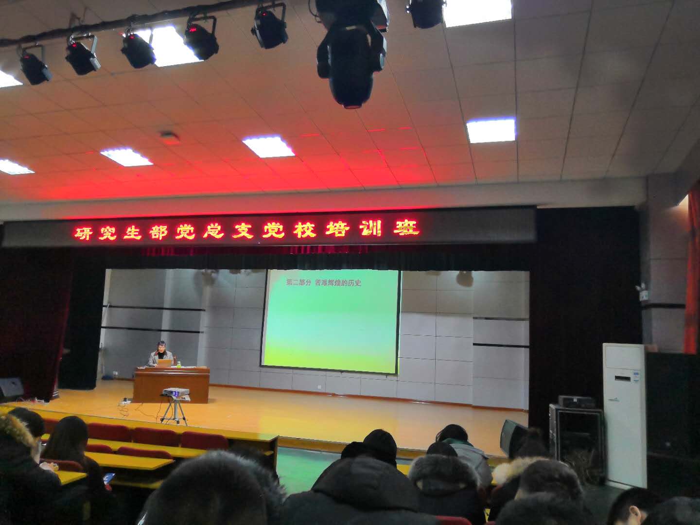 2019年1月7日上午8:00,研究生部党总支2018-2019年度党校培训班开班仪式在秦皇岛校区多功能厅举行。研究生部党总支负责人主持了开班仪式,全体2018级研究生、入党发展对象和预备党员等200余人参加了培训。