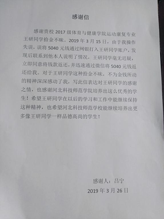 近日,best365体育与健康学院收到了一封来自中国足球学校秦皇岛训练基地的感谢信,信中对2017级运动康复专业王研同学拾金不昧的先进事迹给予了高度肯定。
