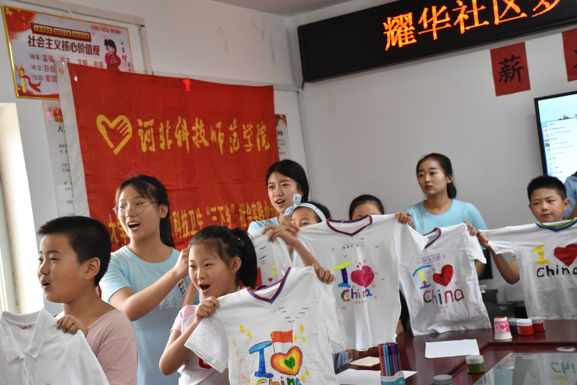 本次实践活动面向耀华社区中小学生,以文化强国为主线开展丰富的文化教育课程及为贫困山区孩子送温暖爱心活动。活动分为文化自信、文化与经济、文化与体育、文化与科技四大部分。队员们以浅显易懂、图文并茂的讲解方式,介绍了应用数学模型建造的雄伟建筑和高科技机器人,孩子们惊叹于各类数学模型精妙的设计,精巧的结构,激发了学生强烈的求知欲望。实践团队员组织孩子们进行DIY“I LOVE CHINA”文化衫绘制并送给汶川贫困山区的一名孤儿、秦皇岛市青龙县陈台子村中小学生,同时还寄去各类图书,本子,铅笔,跳绳,沙包等文具和体育用品,孩子们绘制完文化衫后,齐唱《我和我的祖国》并发自肺腑地说出“我爱我的祖国”之声;同时在现场与一位曾经经历过2008年汶川大地震的学姐进行语音连线,在学姐的叙述中我们知道了后来在党和国家的帮助下,她顺利完成大学学业并考上了研究生,学姐在连线中,鼓励中小学生努力学习科学文化知识回报祖国,回报社会,珍惜党和国家给予人民的安定幸福的的美好生活。队员们在现场进行了机器人表演,机器人灵活的的舞蹈激发了孩子们对高科技发展的浓厚兴趣。