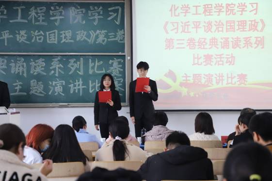 近日,化学工程学院举办了学习《习近平谈治国理政》第三卷经典诵读系列比赛,化学工程学院领导班子成员及各教工党支部成员、预备党员、发展对象和入党积极分子参加活动。