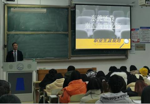 2020年11月27日,财经学院邀请东莞证券秦皇岛营业部负责人李朋飞经理来校作职业生涯准备与规划讲座,财经学院二、三年级保险相关专业的113名同学参加了讲座。