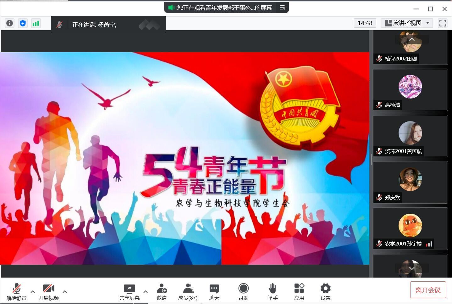 在五四青年节来临之际,农学与生物科技学院开展了以“喜迎二十大、永远跟党走、奋进新征程”为主题的丰富多彩的线上活动,号召广大青年学生在校内闭环学习、居家网课的同时汇聚青春力量,传承五四精神。