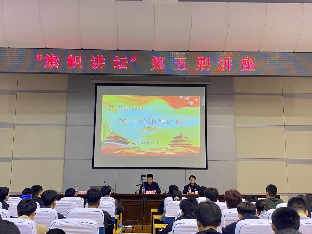 为深入学习贯彻党的二十大精神,深刻领会精神实质、核心要义和实践要求,2023年3月30日下午,体育与健康学院和马克思主义学院联合举行党的二十大精神宣讲报告会。体育与健康学院师生党员、入党积极分子及学生代表和马克思主义学院全体教师参加了报告会。会议由马克思主义学院党委书记党胜利主持,体育与健康学院党委书记致贺词。