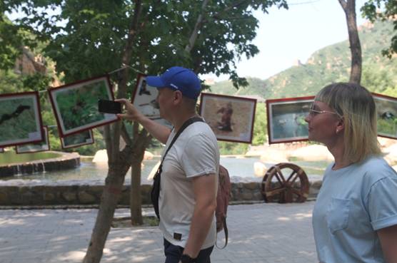 除了中国各地游客,两位俄罗斯游客也被我们的图板展吸引过来,由于语言不通,我们无法用俄语向他们介绍动植物知识,但这仍然无法阻挡他们的热情,俄罗斯朋友用手机录制了我们的科普展留作纪念。