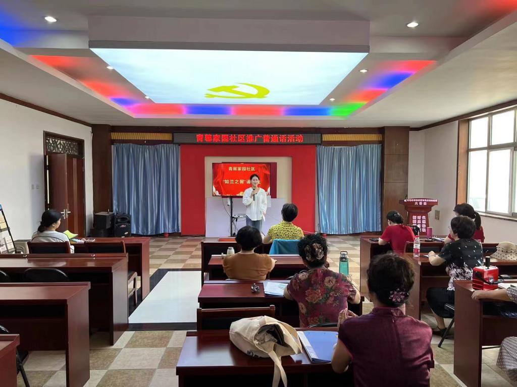 实践团以理论政策普及宣讲为主,丰富居民文化生活为辅开展活动,7月20日在青馨家园社区开展了“推广普通话”主题宣讲活动,实践队员化身宣讲员向社区居民讲解普通话的形成发展过程和相关知识,在推广普通话的同时,也带领大家了解中国历史文化知识。