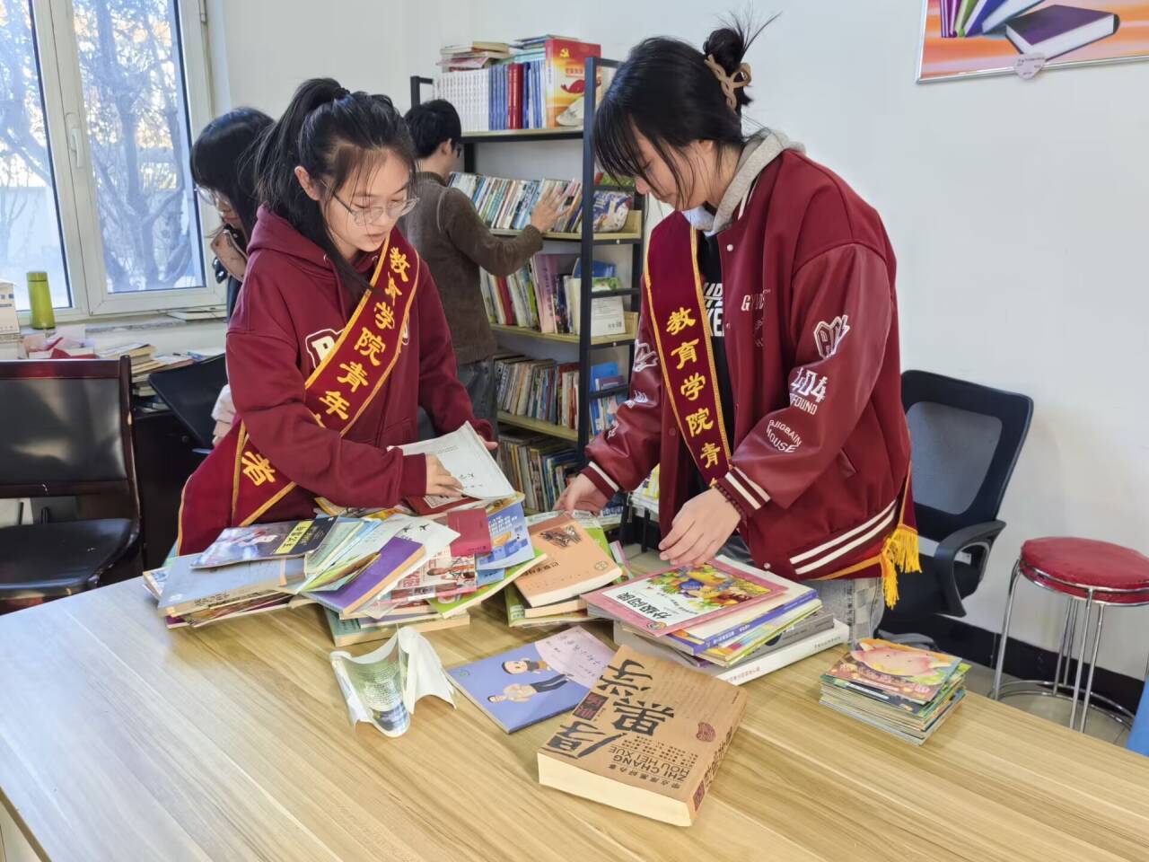 志愿者认真地整理图书