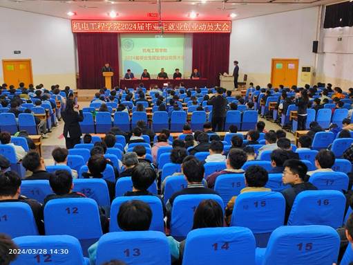 2024年3月28日,机电工程学院2024届毕业生就业创业动员大会在昌黎校区学术报告厅举行。学院党委班子成员、毕业班辅导员(班主任)、专业负责人、教学部主任、企业嘉宾、优秀校友以及全体2020级和2019级学生参加了就业创业动员大会。大会还通过抖音进行了同步直播,毕业生家长也进行了线上观看。