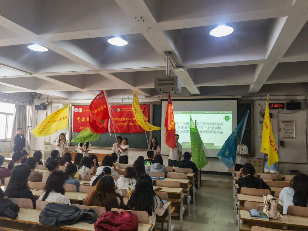在激扬的乐曲中,参会嘉宾为实践小分队代表授旗,标志着农学与生物科技学院参加“2024年全国农科学子联合实践行动”已经全面铺开。