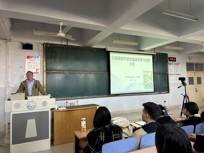 2024 年 10 月 23 日,为了让同学们充分了解就业形势,合理规划职业发展路径,外国语学院邀请教育学院张晓军书记作《25届高校毕业生就业形势与对策分析》专题宣讲会。讲座由外国语学院党委负责人主持,2021 级及 2022 级全体在校生 300 余人聆听了讲座。