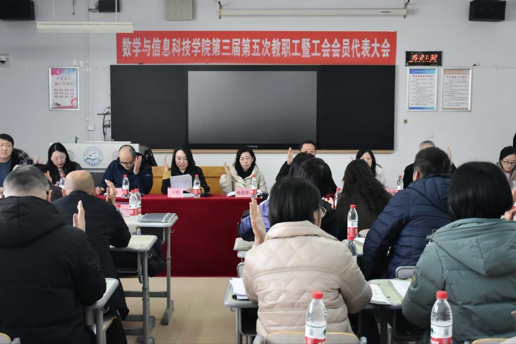 2024年12月12日,数学与信息科技学院第三届第五次教职工暨工会会员代表大会顺利召开。会议由分工会主席主持,学院教代会代表和工代会代表参加了会议。