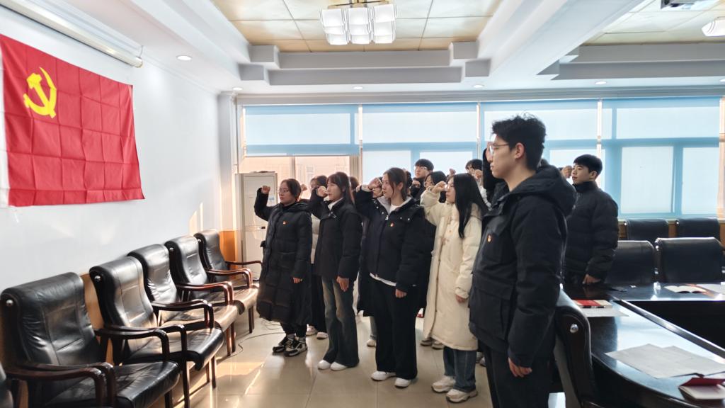 在领誓人李东海同志的带领下,预备党员们面向党旗,举起右拳,庄严宣誓:“我志愿加入中国共产党,拥护党的纲领,遵守党的章程……”誓言铿锵有力,回荡在会场,展现出新时代大学生党员对党忠诚、为共产主义事业奋斗的坚定信念。