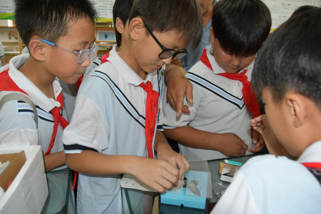 小学生们正在展示自己制作的蝴蝶标本(一)