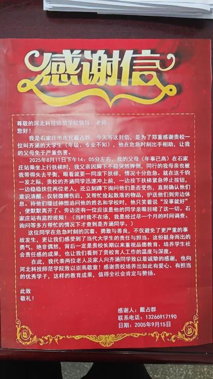 2025年9月15日,石家庄市民送来感谢信,感谢机电工程学院齐涵同学,在危急时刻出手相助,让他的父母免于严重伤害。赞扬该同学沉着、勇敢与善良,用实际行动诠释了当代大学生的责任与担当。