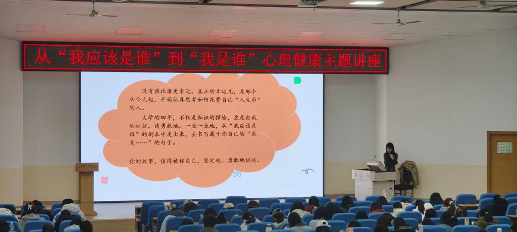 2025年11月5日,为引导学生探索自我认知,缓解内心压力,促进学生心理健康全面发展,食品科技学院在学术报告厅举办了以“从‘我应该是谁’到‘我是谁’”为主题的心理健康专题讲座。本次讲座邀请到学校大学生心理健康教育与咨询中心韩露蕾老师担任主讲,学院各年级学生踊跃参与,现场座无虚席。