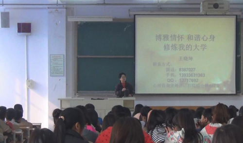 王晓坤老师以《博雅情怀,和谐身心,修炼我的大学》为主题,将传统文化和大学生的身心健康相结合,引导大学生树立良好的行为习惯和健康的心理素质。王智华老师以《如何度过大学适应期》为主题,从如何适应大学生活、如何适应大学学习以及如何适应大学的同学关系等七个方面,引导学生及时的调整心态,规划自己的人生目标,珍惜同学之间的情谊,体验到自己的存在价值。两位老师的专题讲座紧贴学生实际,讲解有理有据,分析入情入理,受到现场学生热烈欢迎。(编辑:孙艳敏 审稿:田 毅)