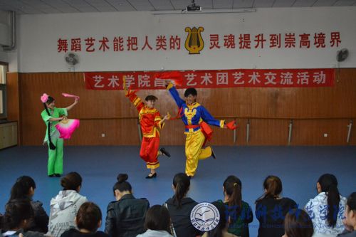 2012年4月16日,艺术学院在开发区校区开展了艺术大讲堂活动。艺术学院舞蹈教学部的师生与昌黎艺术团的演员们在学院舞蹈教室进行了艺术交流。昌黎艺术团的演员们为同学们表演了具有地方民间特色,被列为国家级非物质文化遗产名录的“昌黎秧歌”。演员们那扎实的基本功和精彩的表演以及“绝活”展示,让同学们大开眼界。扮演“妞、蒯、丑”的演员分别对三个角色的基本动作和基本技巧进行了讲解和示范,并与同学们进行了现场互动,同学们进一步增加了学习和传承我国的民间艺术,舞蹈教学民族化的积极性。(编辑:孙艳敏)