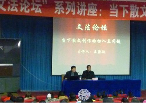 2011年12月8日,文法学院邀请著名评论家、《散文百家》常务副主编王聚敏给广大的文学爱好者作了题为《当下散文创作的切入点问题》的学术报告。文法学院400余名师生一起聆听了本次报告。