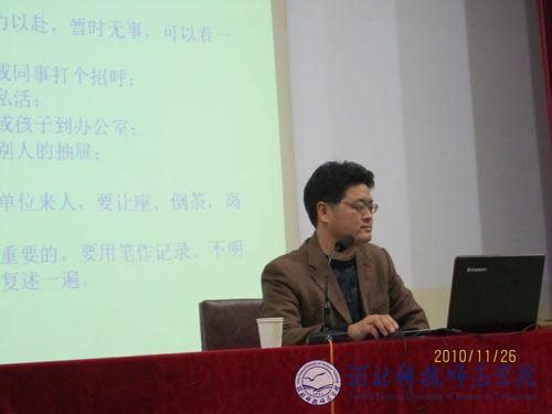生命科技学院党委书记贠小波老师在昌黎校区主讲了《社交礼仪知识》讲座。校心理咨询室王晓坤老师在开发区校区主讲了《心身和谐的大学生,境界高雅的团干部》讲座。原校学生会主席宋军强同学在秦皇岛校区主讲《从我做起,树立良好干部形象》讲座。本期学团干部培训共举行6场,主要围绕办公室文字技能、学生干部应具备的素质和能力、团的理论知识等几个方面展开。