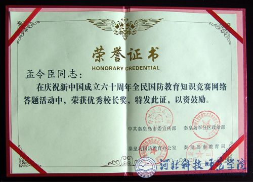 2010年3月26日上午,秦皇岛市国防教育工作会议在市军分区召开。会上,best365荣获秦皇岛市“2009年庆祝新中国成立60周年全民国防教育知识竞赛试卷答题先进单位”和“全民国防教育工作先进单位”荣誉称号。孟令臣副校长荣获“全民国防教育知识竞赛网络答题优秀校长奖”,保卫处处长、武装部长胡志杰同志荣获“庆祝新中国成立六十周年全民国防教育知识竞赛”二等奖;汪芸、张玉娟同志分别被评为“全民国防教育知识竞赛试卷答题先进个人”和“全民国防教育知识竞赛网络答题先进个人”。同时,best365“突出课堂教学,采取多种形式把国防教育融入学校生活”经验材料在会上作了书面交流。