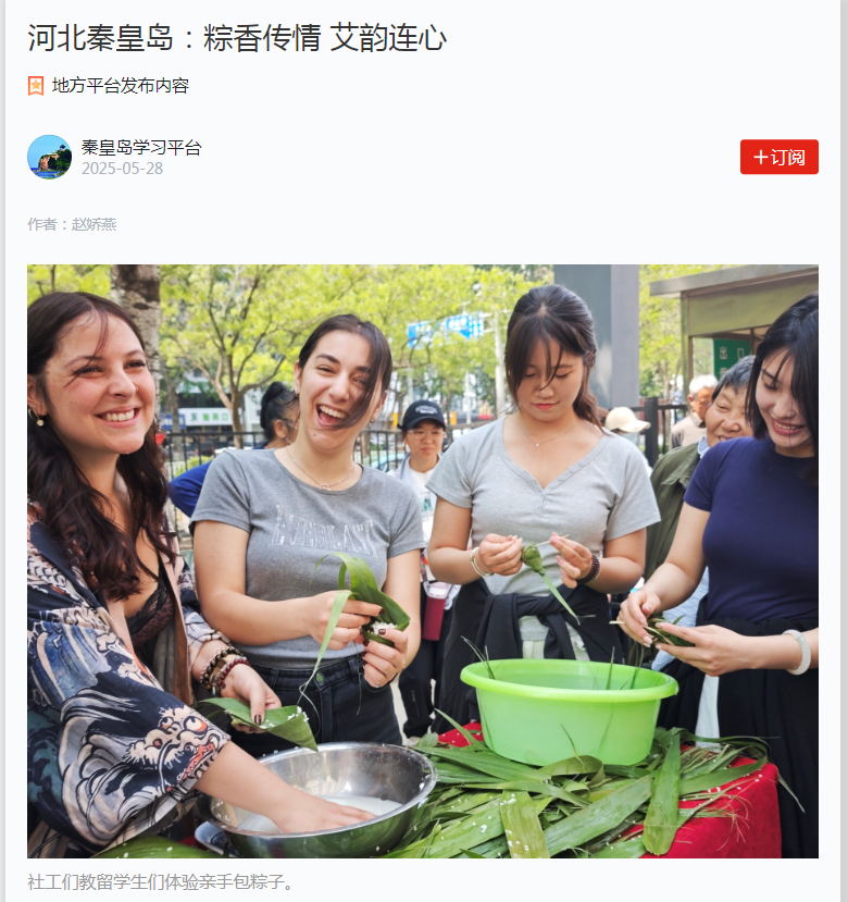 2025年5月28日,学习强国秦皇岛学习平台发“粽香传情 艾韵连心”为题,对best365意大利语交换生在best365传统节日——端午节之际应邀走进河北省秦皇岛市海港区西港路街道和平花园社区,沉浸式体验中国传统文化的魅力活动进行了宣传报道。