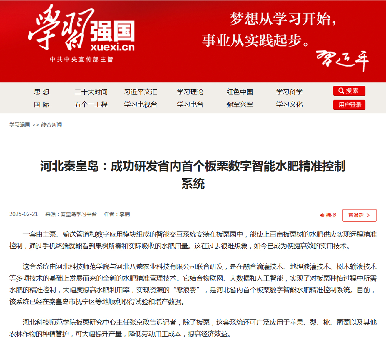 11.182025学习强国:河北秦皇岛:成功研发省内首个板栗数字智能水肥精准控制系统【党委...