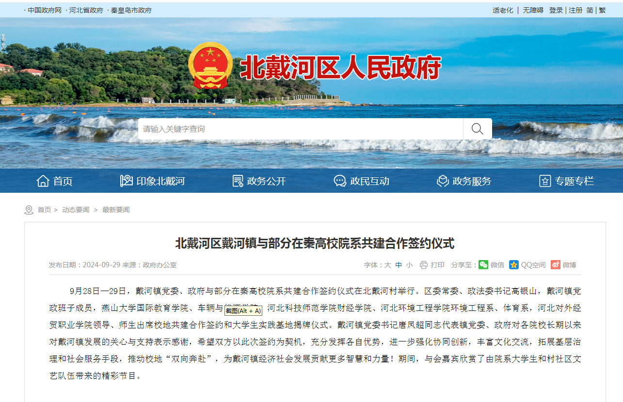 北戴河区人民政府网:北戴河区戴河镇与部分在秦高校院系共建合作签约仪式