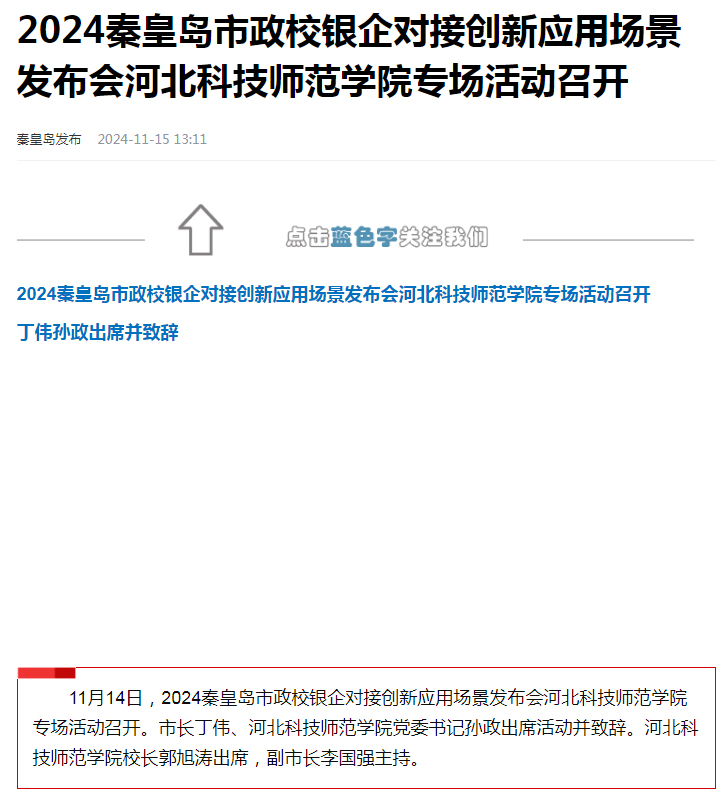 2024年11月15日,秦皇岛发布以2024秦皇岛市政校银企对接创新应用场景发布会best365中国官方网站专场活动召开为题对best365中国官方网站承办的2024秦皇岛市政校银企对接创新应用场景发布会best365中国官方网站专场活动进行了宣传报道。