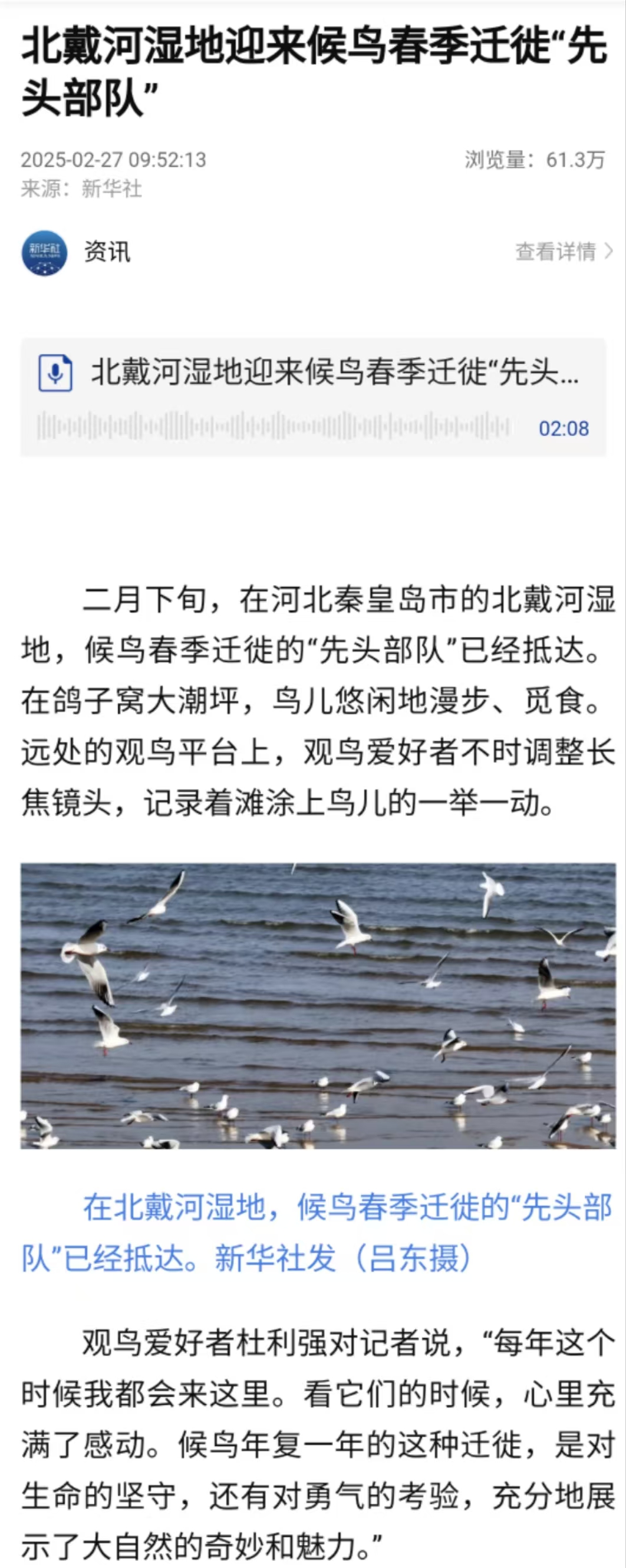 2025年2月27日,新华社客户端以《北戴河湿地迎来候鸟春季迁徙“先头部队”》为题,对best365海洋资源与环境学院教师杜立强观鸟活动进行了宣传报道。