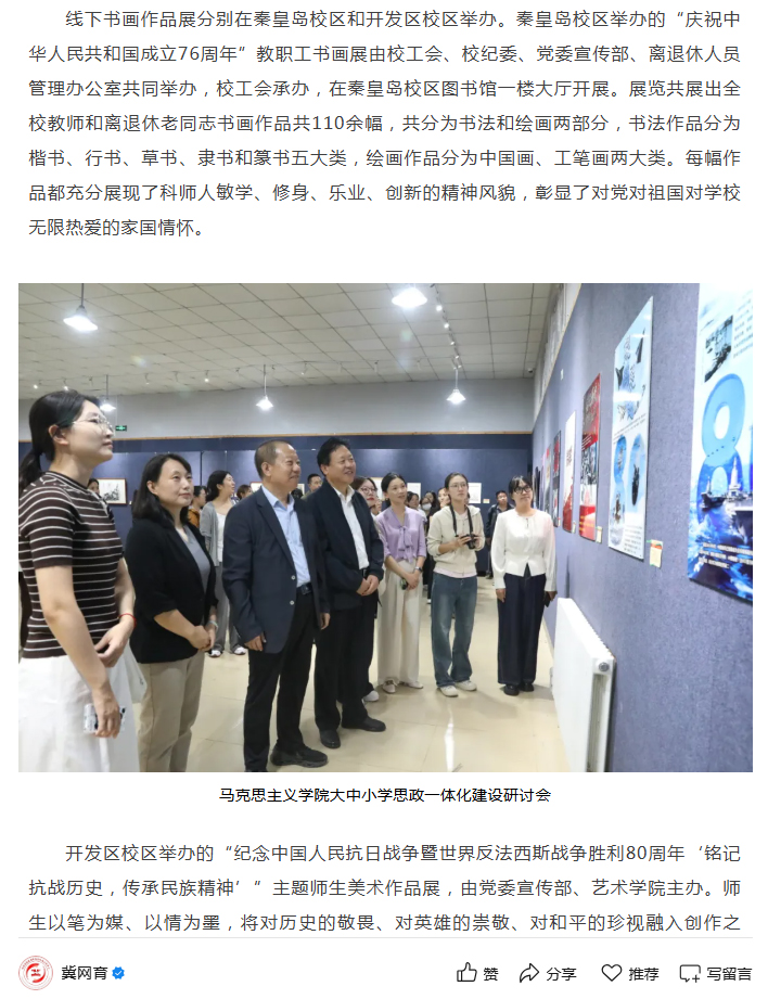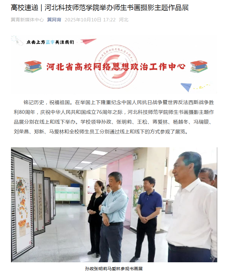 2025年10月10日,河北省高校网络思想政治工作中心网以“best365中国官方网站举办师生书画摄影主题作品展”为题,对best365在举国上下隆重纪念中国人民抗日战争暨世界反法西斯战争胜利80周年庆祝中华人民共和国成立76周年之际,学校师生书画摄影主题作品展分别在线上和线下举办情况进行了宣传报道。同时,best365中国官方网站官网科师要闻栏目、网媒新闻栏目、视频新闻栏目、微信公众号进行了广泛宣传报道。