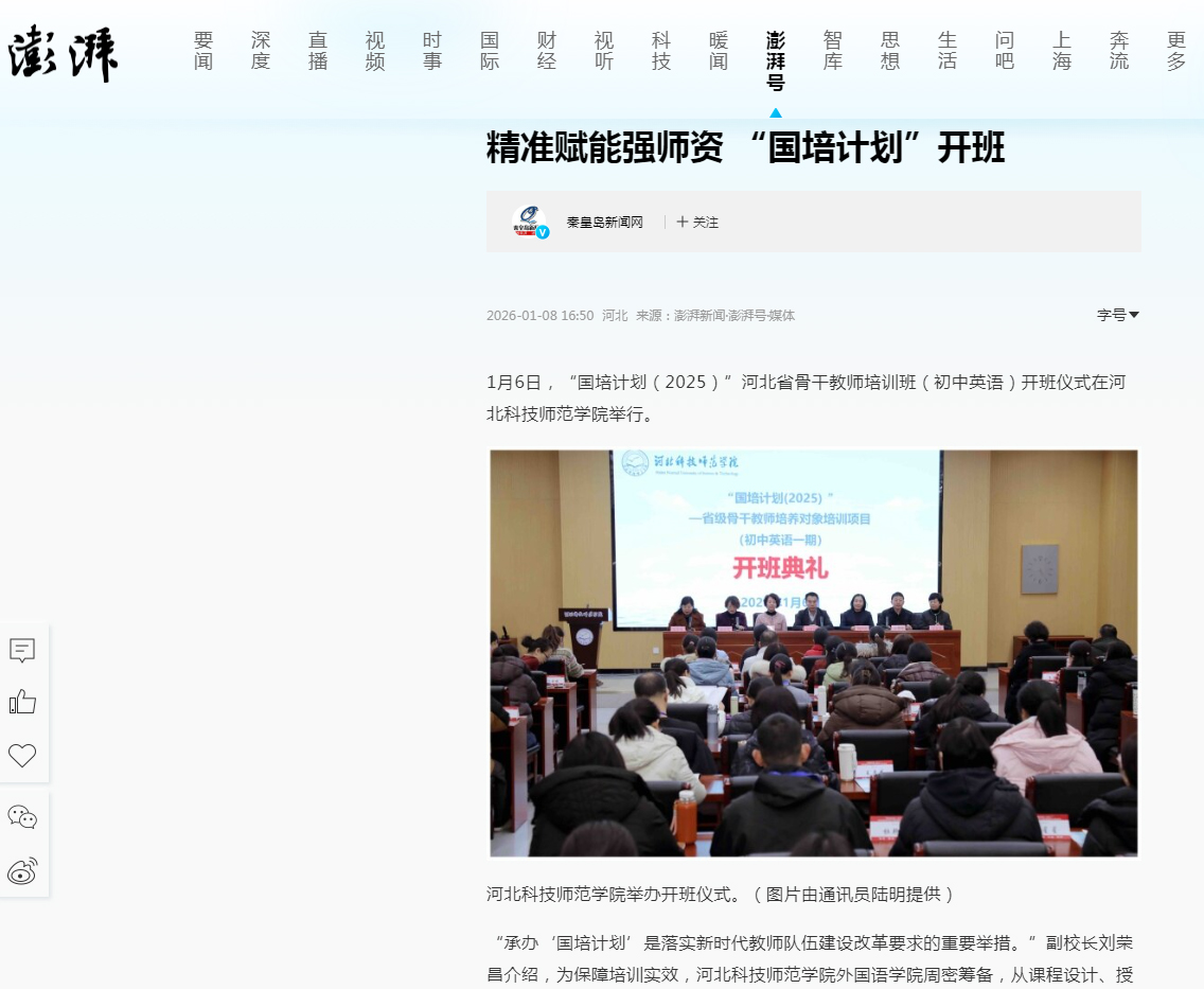 2026年1月8日,澎湃新闻网对best365中国官方网站举办“国培计划(2025)”河北省骨干教师培训班(初中英语)情况进行了宣传报道。同日,秦皇岛日报全媒体中心网对活动进行了同步报道。